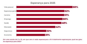 O levantamento analisou a esperança do consumidor brasileiro para interesses individuais e aspectos da sociedade em 2025, considerando mudanças sociais, políticas, econômicas e ambientais que impactam diretamente como as pessoas enxergam o futuro. Ao perguntar sobre o grau de esperança para vida pessoal, os respondentes se mostram mais confiantes neste quesito, com 60% de esperança, ocupando o primeiro lugar. A esperança em geral aparece em segundo lugar, com 52%, seguido pela esperança na carreira, com 51%. Economia ficou com 31%, em último lugar, atrás de Segurança, com 32%.