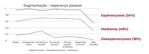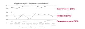 Divididos em esperançosos, medianos e desesperançosos, os respondentes se mostraram mais desesperançosos em relação à sociedade, respondendo por 30%, enquanto esperançosos nesta segmentação responderam por 26% e os medianos por 44%. Quando questionados por esperança pessoal, os esperançosos representam a maioria, com 34%, os medianos por 48% e os desesperançosos, 18%.